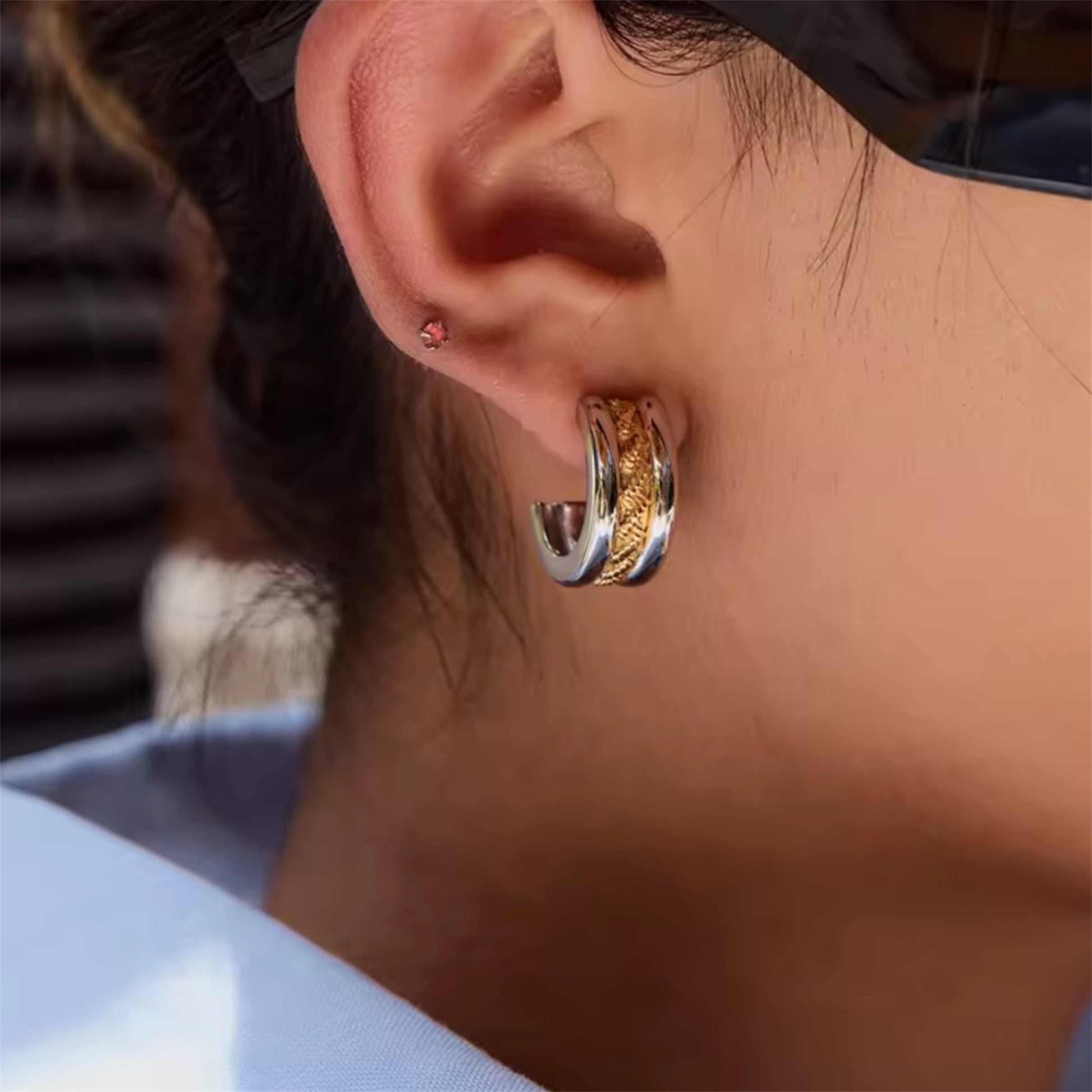 These elegant, braided C hoop earrings showcase a refined bi-tone design with a delicate braided pattern along the center line. Their sophisticated style offers a perfect balance of modern flair and classic detail.