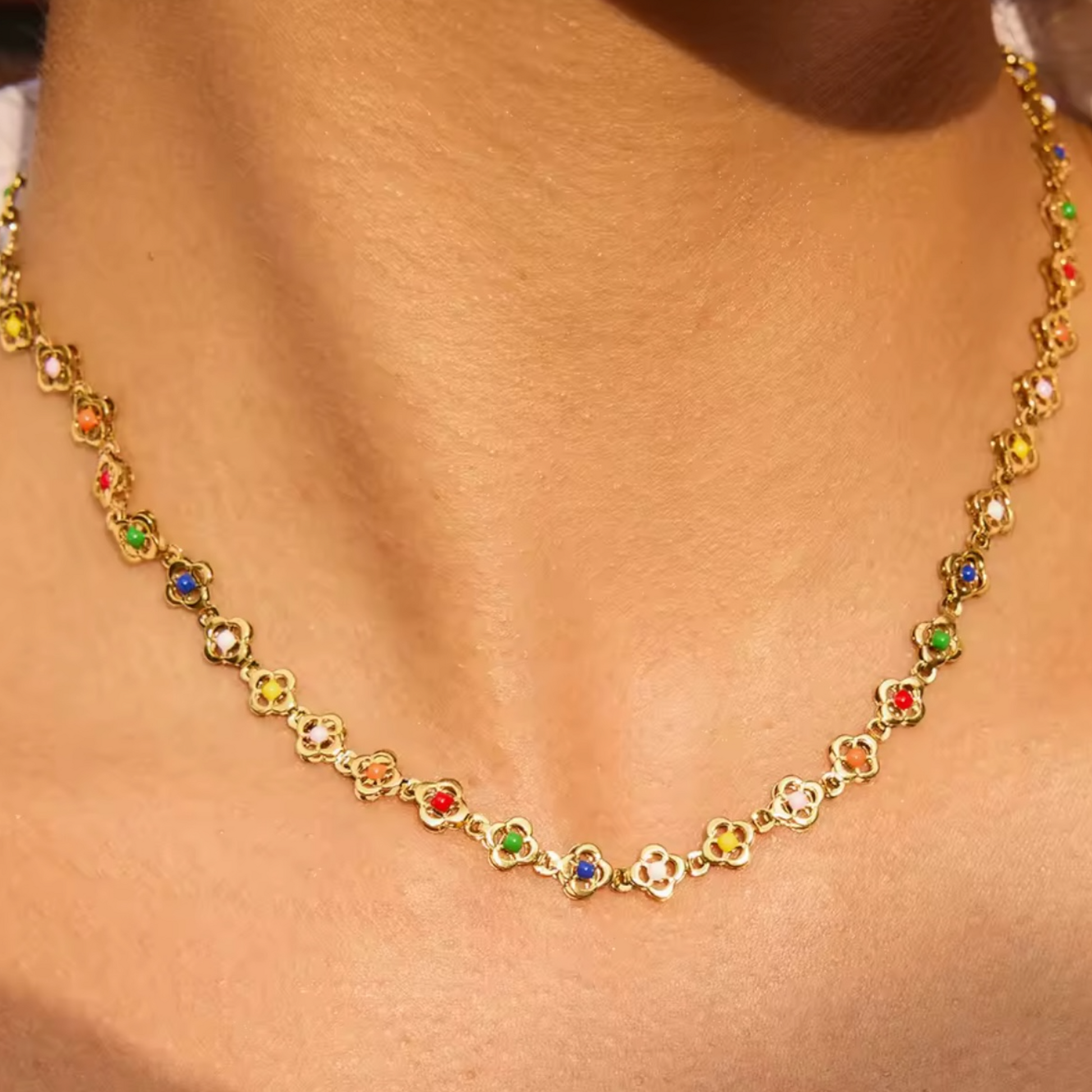 The Clover Color Necklace features a delicate clover-shaped chain centered with vibrant, colorful beads. This sophisticated accessory combines elegant design with a pop of color, making it the perfect piece to enhance your ensemble with understated charm and refined style.