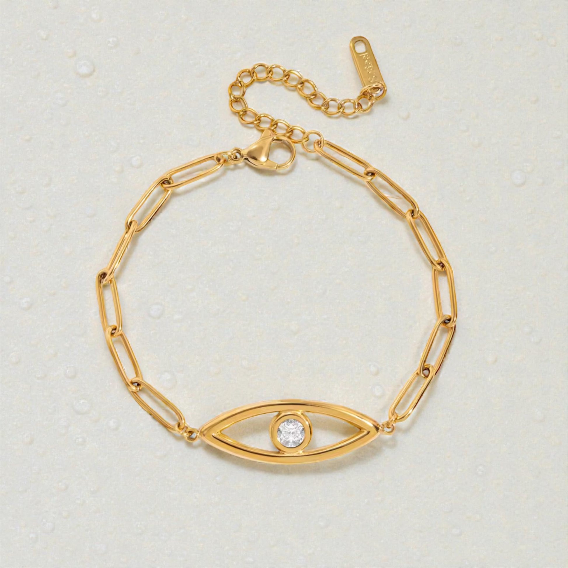 Ward off bad vibes and add some glamour to your outfit with our Evil Eye Chain Bracelet. Featuring a framed evil eye adorned with sparkling zirconia, this bracelet not only looks beautiful but also symbolizes protection and good luck. Keep negativity at bay while looking stylish!