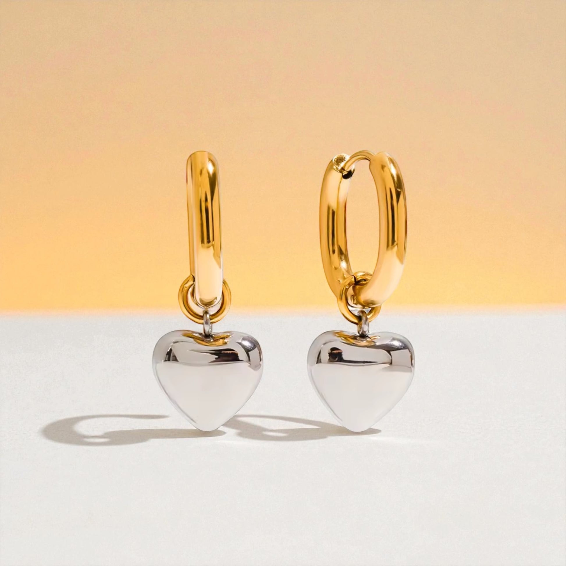 Fall in love with our Love Drop Earring! These delicate square gold hoops hold a shining silver heart pendant, adding a touch of romance to any outfit. Experience the joy and beauty of love with these stunning earrings.