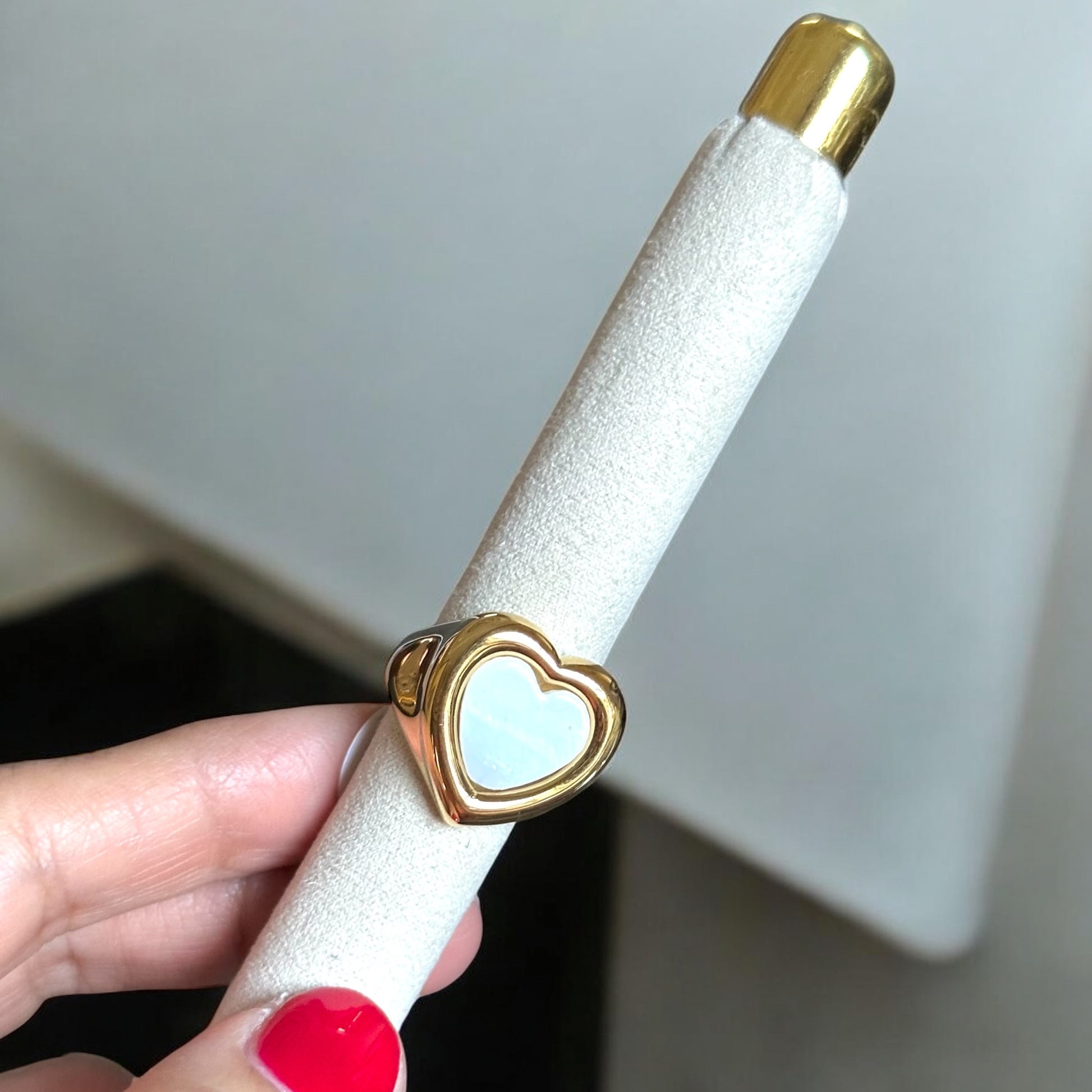The Love Pearl Ring features a beautifully crafted heart-shaped setting accented by a luminous pearl, offering a perfect blend of classic romance and contemporary style. This exquisite ring adds a touch of sophistication and meaningful elegance to any occasion.