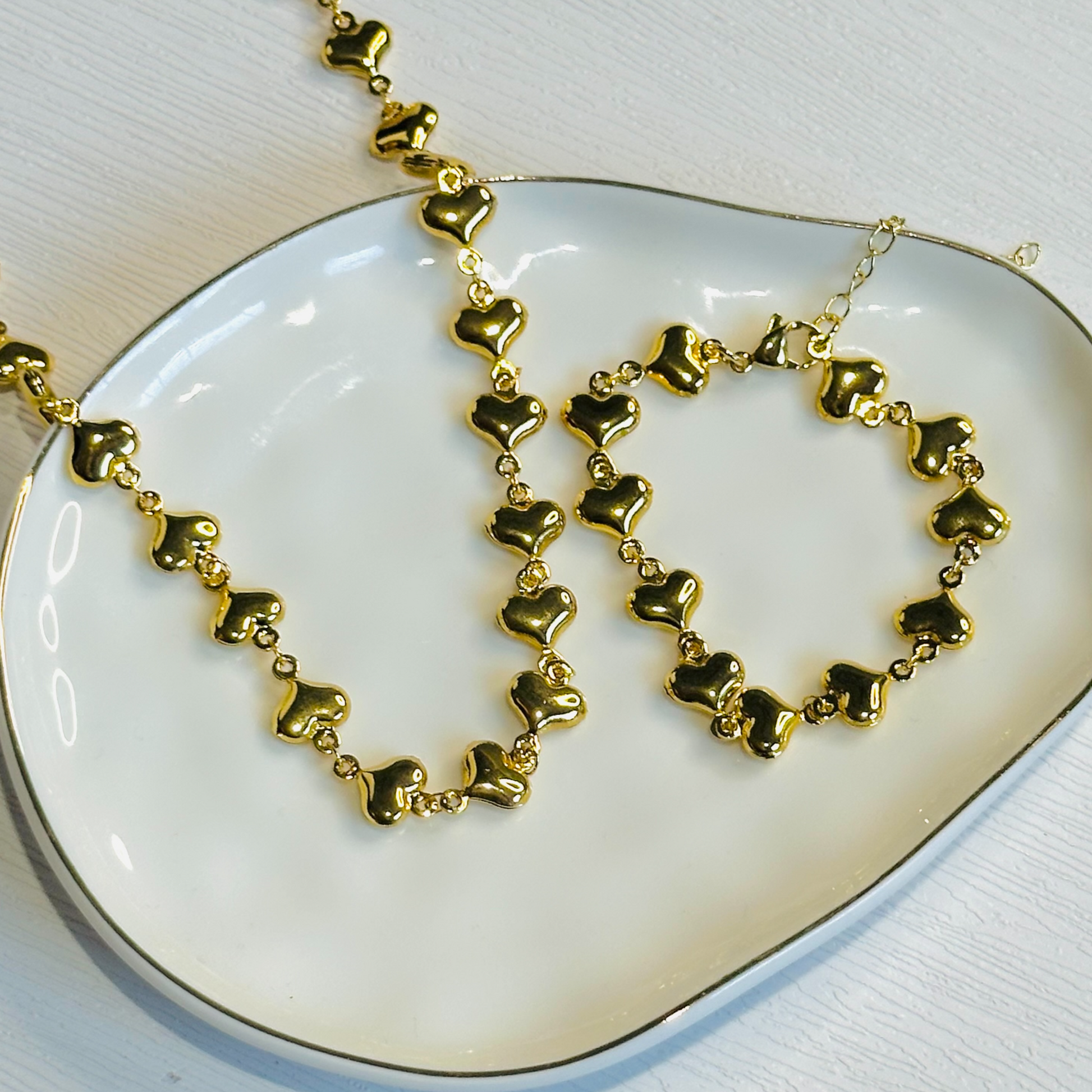The Love Set pairs a beautifully crafted gold necklace with a matching bracelet, each featuring multiple intertwined heart charms. This sophisticated combination offers a delicate yet impactful way to express affection, perfect for adding a touch of elegance to any occasion. A timeless symbol of love and style.