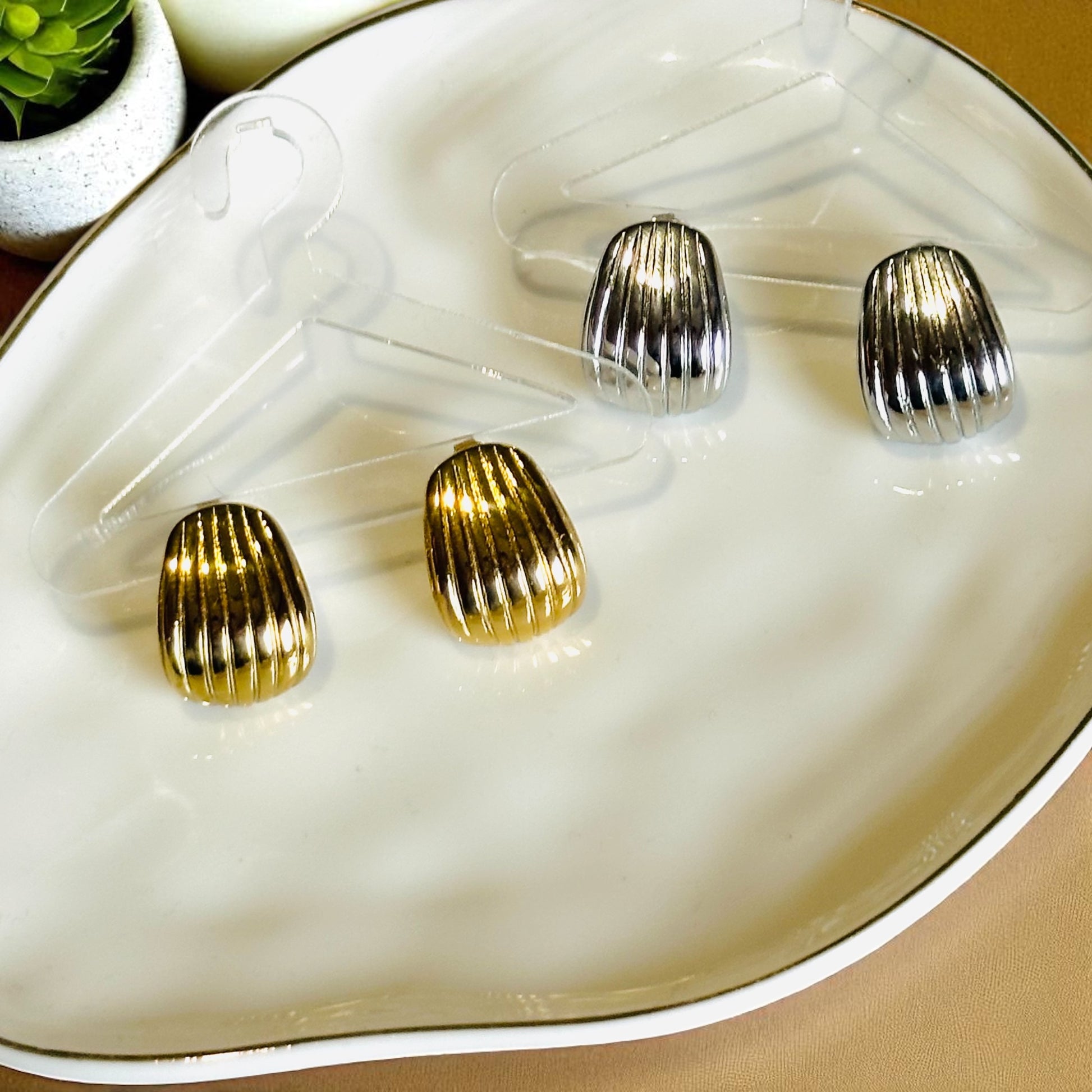 The Ripple Square Earrings combine sleek geometry with a delicate ripple texture for a polished, modern look. These stud earrings catch the light softly, offering a sophisticated accent that enhances any outfit.