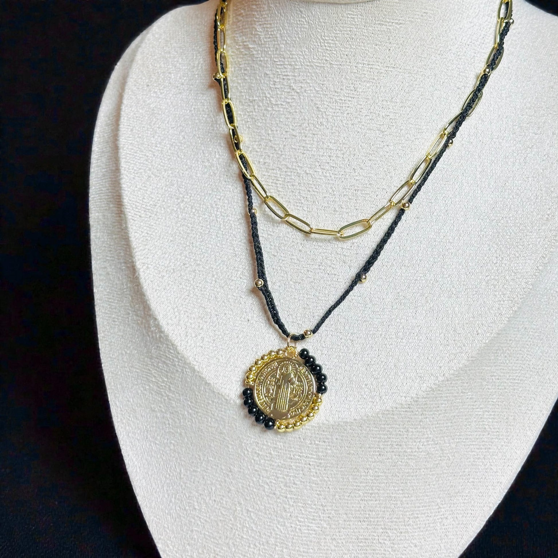 Elevate your style with our San Benito Medallion Necklace. This stunning double necklace features a captivating San Benito medallion pendant, adding a touch of elegance to any outfit. Exude confidence and charm with this one of a kind accessory.