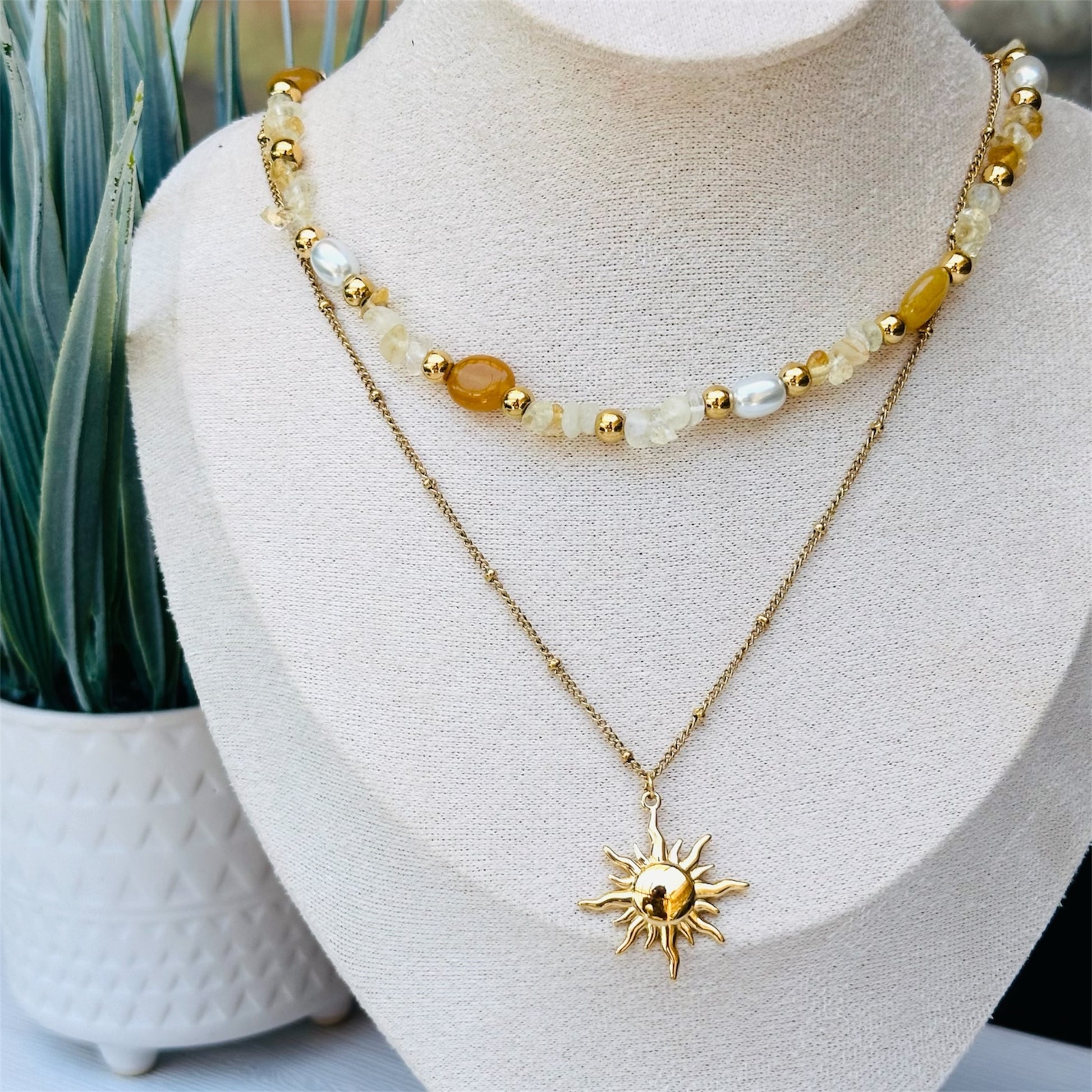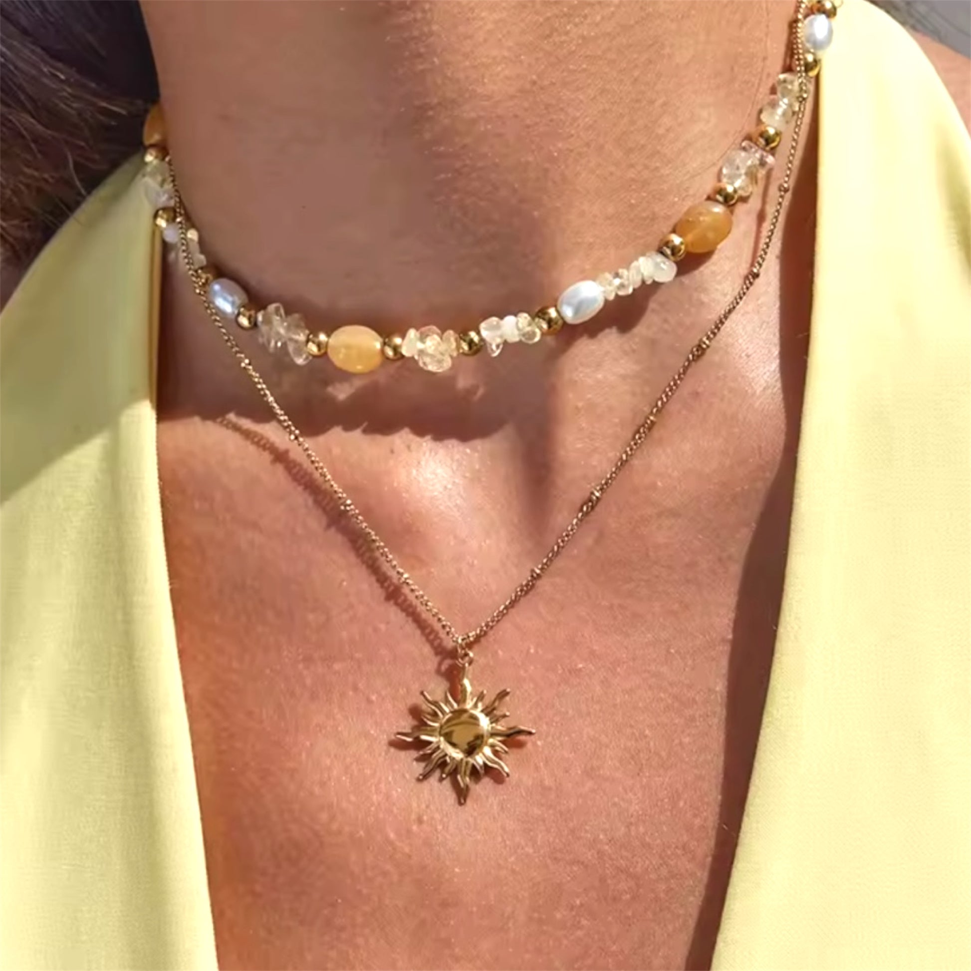 Elevate your style with the Sunshine Necklace, featuring two distinct chains for a layered look. One chain showcases a radiant sun charm, symbolizing warmth and positivity, while the other is crafted from natural stones, adding a touch of earthy elegance.