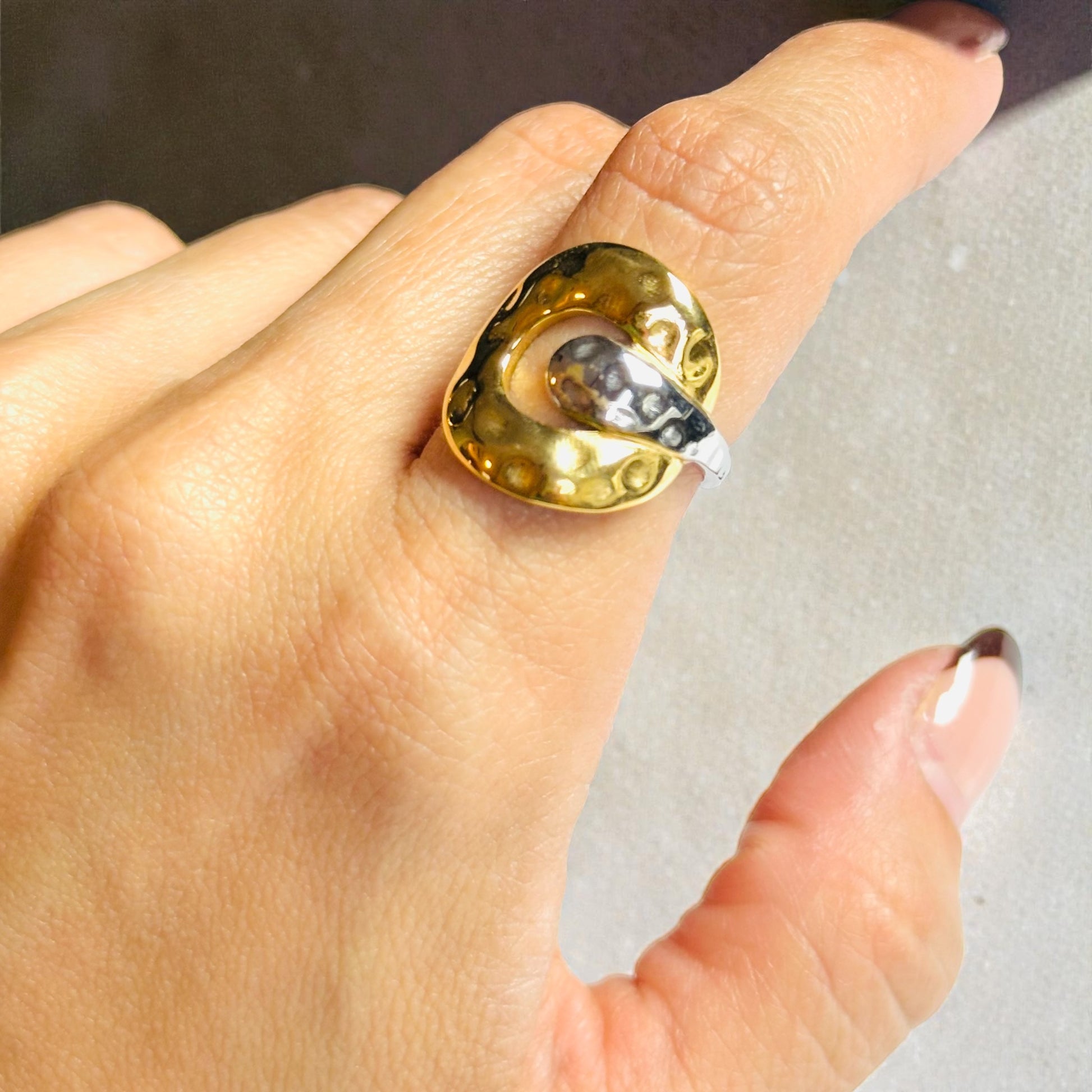 Add some texture to your collection with our Texture Bicolor Ring! Featuring a unique and eye-catching design, this ring will add a touch of sophistication and style to any outfit. Perfect for any fashion-forward individual looking to make a statement.