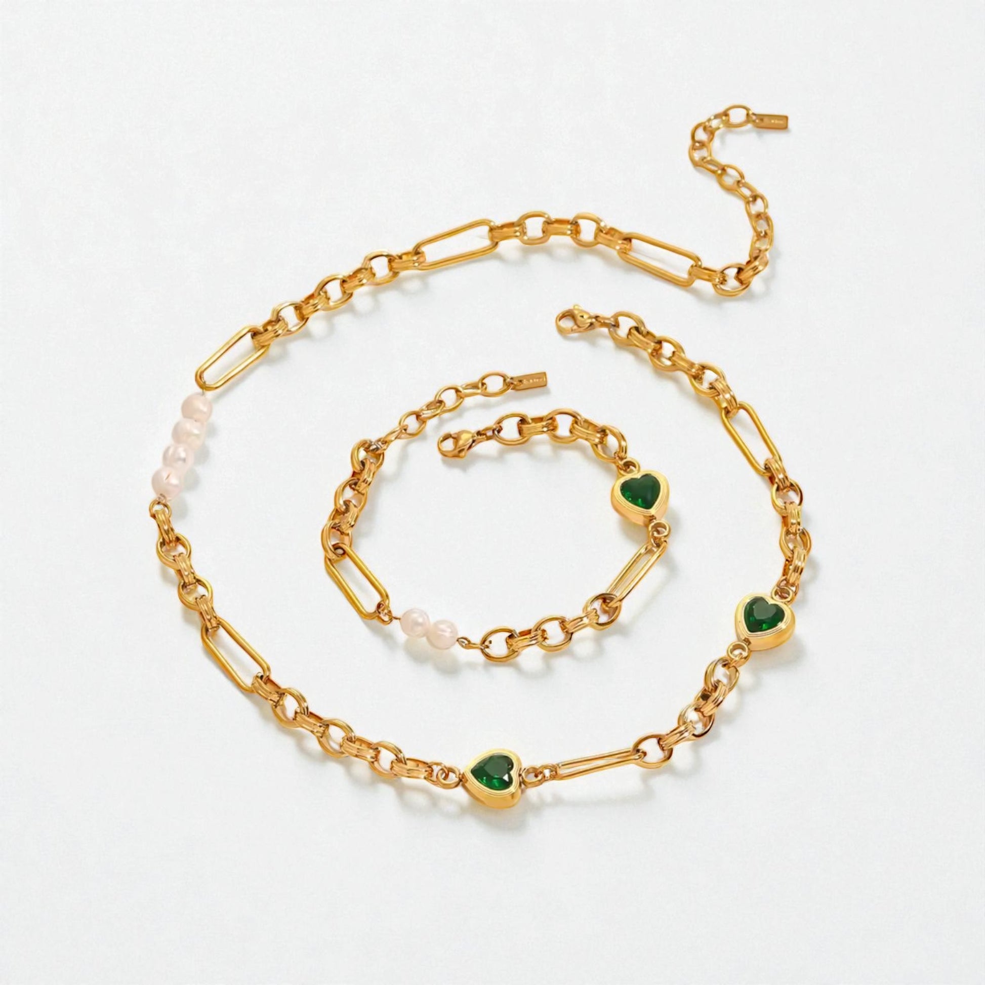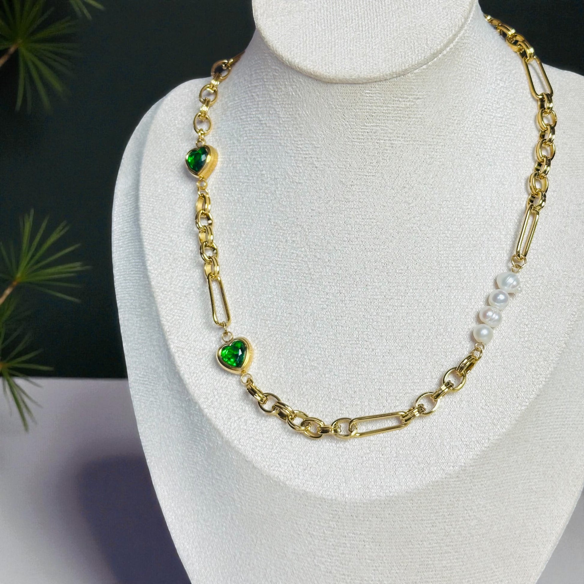 This elegant necklace features a delicate chain adorned with lustrous freshwater pearls and striking green emerald heart charms. Perfect for adding a touch of sophistication and natural beauty to any outfit. Short and sweet, but no less impressive.
